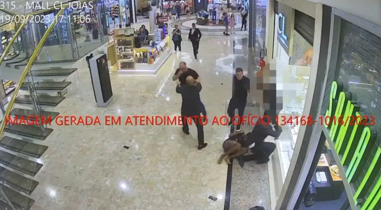 O vídeo mostra ainda que o homem que acompanhava Marcos Braz no shopping também teria participado das agressões ao entregador.