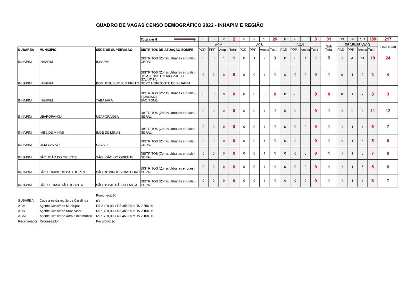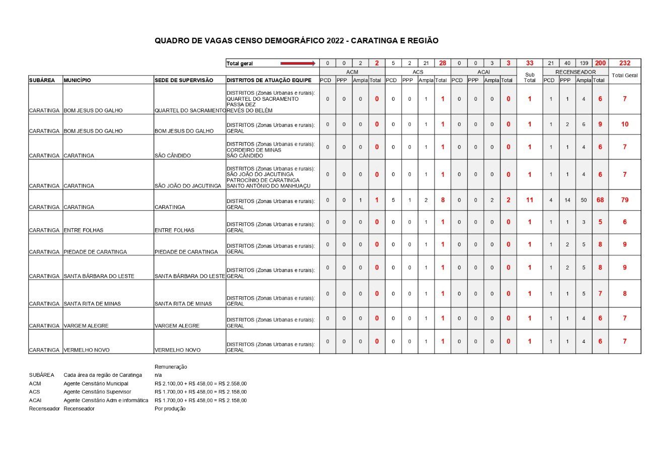 Joelson Carvalho detalha as vagas que estarão disponíveis. “São 80 vagas para Caratinga e 13 para supervisores, dentre elas um vai ser chefe do posto. Conseguimos dividir o município de Caratinga em mais duas áreas, porque são mais distantes, que são as de São Cândido e São João do Jacutinga. Teremos em cada uma delas o supervisor, uma vaga específica. Então na hora da inscrição, deve escolher se quer uma vaga para Caratinga, São Cândido ou São João do Jacutinga. A mesma coisa relação aos recenseadores, que estão distribuídas. E, além de Caratinga, temos vagas em todo o País”.