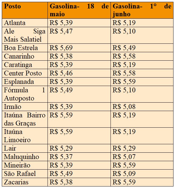 Já no dia 25 de maio, o Procon Caratinga realizou uma pesquisa de preços nos postos da cidade e o valor médio da gasolina foi encontrado por R$ 5,09.