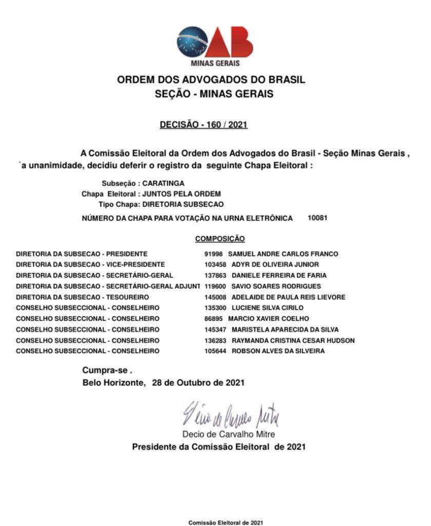 CARATINGA – As eleições na Seccional da OAB (Ordem dos Advogados do Brasil) de Minas Gerais ocorrem nesse sábado (27), de 8h às 17 h em todo o estado. Serão eleitos os representantes da advocacia estadual nas 248 subseções bem como os integrantes da diretoria, conselho seccional, diretoria da caixa de assistência, conselheiros federais e suplentes, para o triênio 2022/2024.