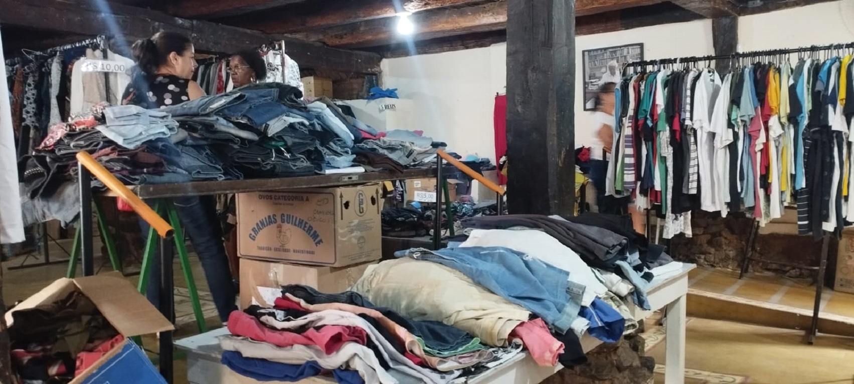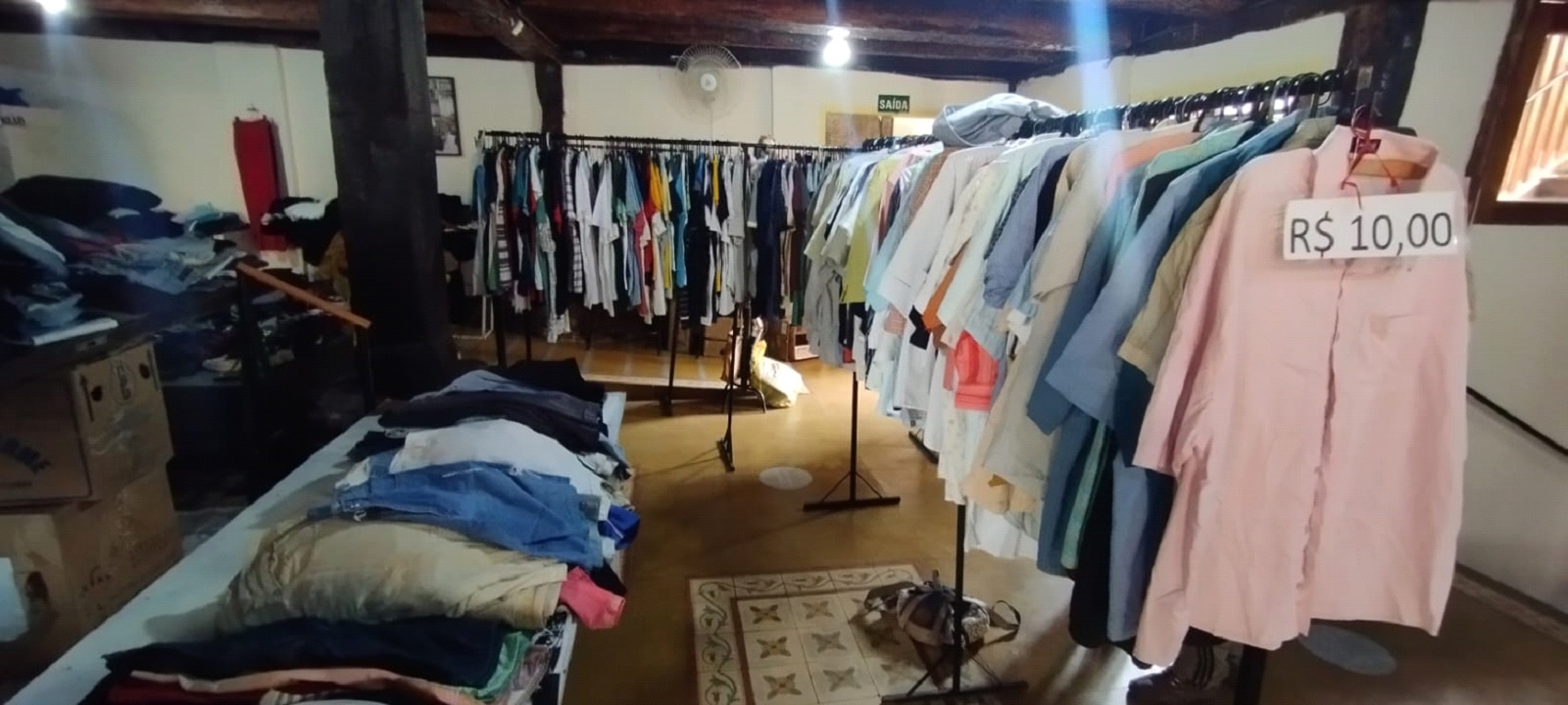 O bazar conta com produtos seminovos, comercializados a partir de uma triagem da equipe. “Roupas a partir de R$ 5. Dessa vez ganhamos duas máquinas de escrever seminovas, funcionando, elétricas e estamos vendendo a R$ 200. Estou conclamando a comunidade, de modo geral, para que nos apoie mais uma vez, para atender tanto o público de Caratinga como região. O pessoal que trabalha na área rural tem nos procurado para camisas de manga comprida e calças para trabalhar no meio rural. Temos muito produto, calçado, camisa, calça, vestidos. São vários produtos e estamos aqui aguardando vocês”.