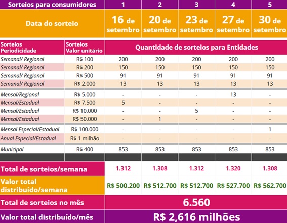 O primeiro será no dia 16 de setembro, com a distribuição de R$ 621 mil em prêmios, variando de R$ 100 a R$ 7,5 mil. Ainda no mês de setembro, serão realizados outros quatro sorteios, nos dias 20, 23, 27 e 30/9, inclusive um dos prêmios mais aguardados, no valor de R$ 100 mil.