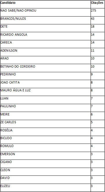 As intenções foram captadas entre 8 e 12 de agosto de 2024 nos distritos e bairros. Foram ouvidas, ao todo 600 pessoas. Ao serem perguntadas, “se as eleições fossem hoje, em quem você votaria para vereador?”, 275 entrevistados disseram que ‘não sabem’ e 43 disseram que pretendem votar em ‘branco ou anular o voto’, num total de 282 entrevistados nominaram seu candidato a vereador, ou seja. Os mais citados são eles: