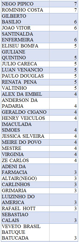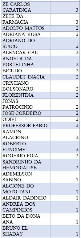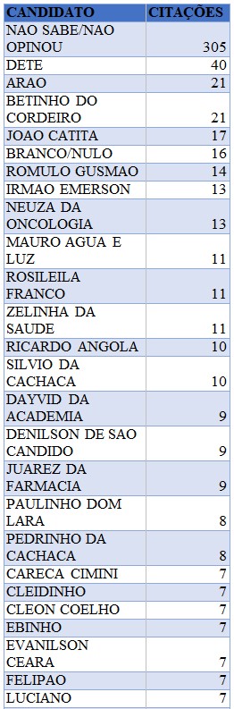 As intenções foram captadas entre 7 e 10 de setembro de 2024 nos distritos e bairros. Foram ouvidas, ao todo 800 pessoas. Os entrevistados foram questionados: “Se as eleições fossem hoje, em quem você votaria para vereador?”. Os mais citados foram: