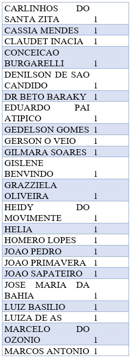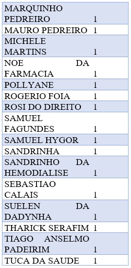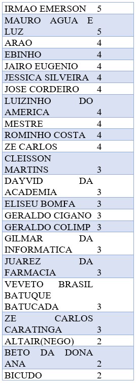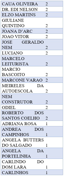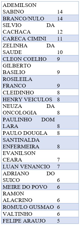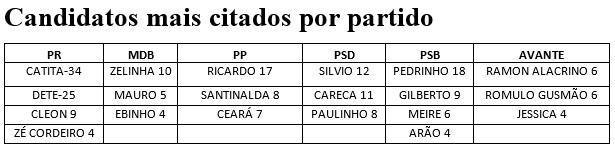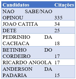 Os entrevistados foram questionados: “Se as eleições fossem hoje, em quem você votaria para vereador?”. Os mais citados foram:
