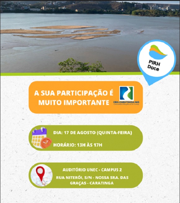 O encontro será realizado no Auditório da UNEC – Campus 2, das 13h às 17 horas, e terá entre os participantes representantes da ANA, do Instituto Mineiro de Gestão das Águas (IGAM) e conselheiros do CBH-Caratinga. Também são esperados representantes dos municípios que compõem a bacia hidrográfica, usuários de água e entidades que atuam na preservação ambiental. O evento é aberto a toda comunidade e o documento pode ser acessado pelo link: www.cbhdoce.org.br/repositorio.