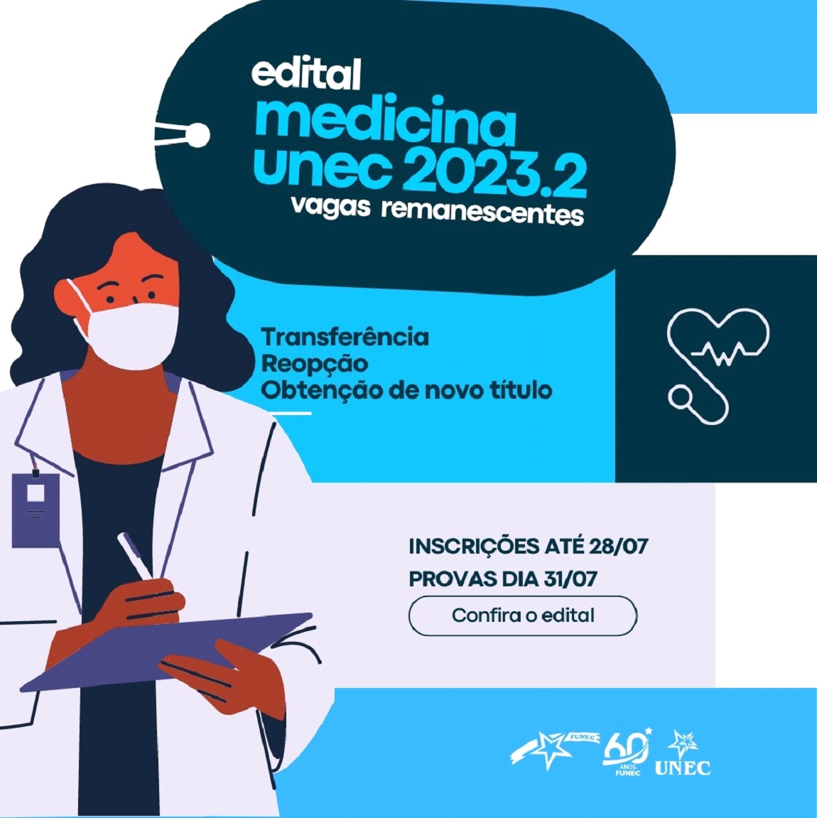 Serão ofertadas inicialmente oito vagas para o curso de Medicina Unec, contemplando as modalidades de transferência; obtenção de novo título e reopção de curso. As inscrições devem ser feitas através do site www.unec.edu.br, onde também estão disponíveis, o edital e link para pagamento.