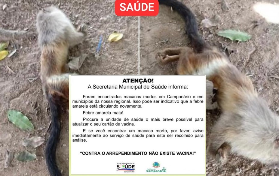 A @pref.campanario fez uma alerta geral para a população, nesta terça-feira (08), sobre o aparecimento de vários macacos mortos no município e em cidades vizinhas, o que pode denotar a circulação da Febre Amarela na região.