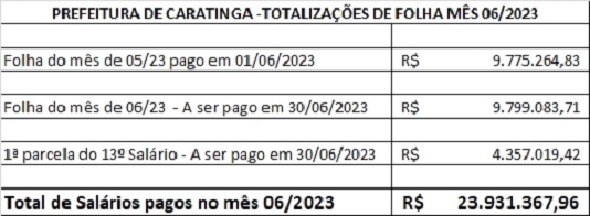 CARATINGA- A Prefeitura de Caratinga realiza nesta sexta-feira (30), o pagamento antecipado do salário referente ao mês de junho e também da primeira parcela do 13º salário. Somados aos mais de 9 milhões e setecentos mil reais pagos no dia primeiro de junho, referente a folha do mês de maio, a Prefeitura injetou neste mês de junho quase 24 milhões de reais na economia da cidade.