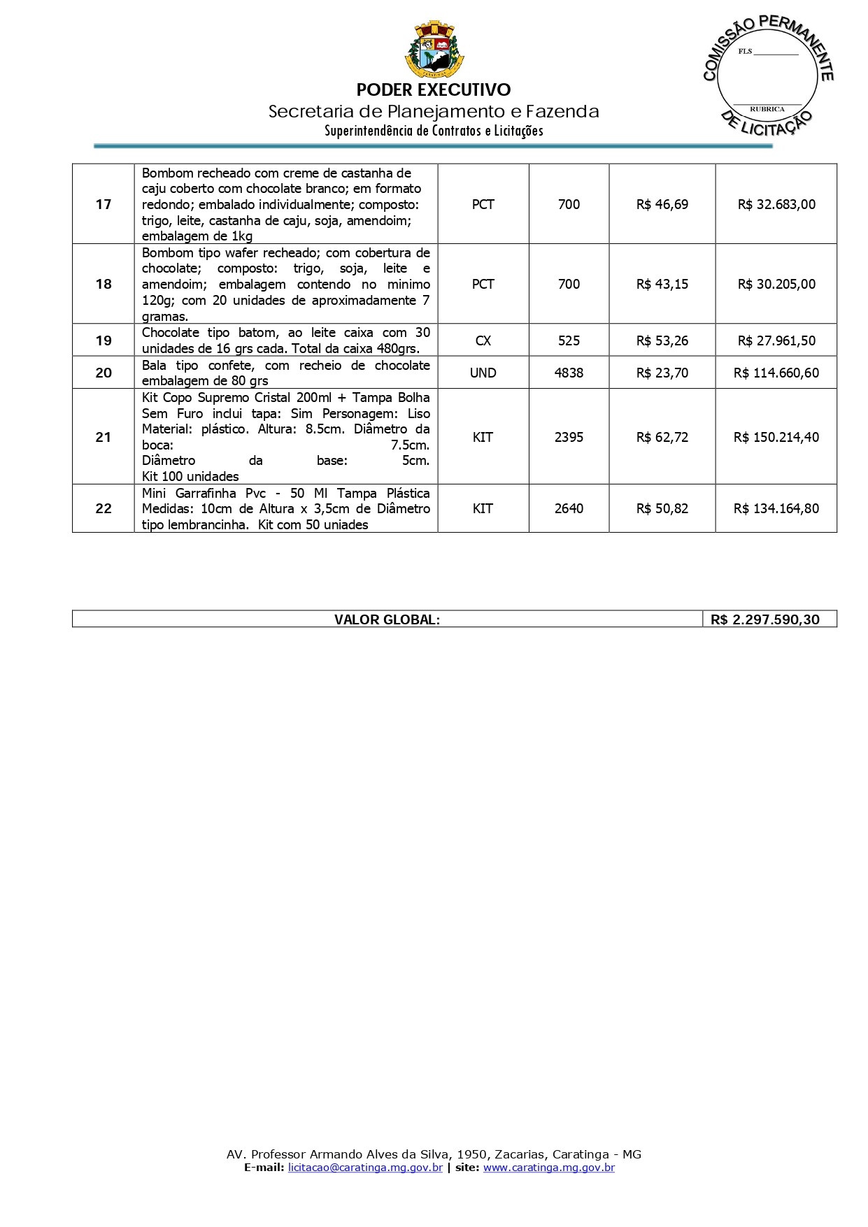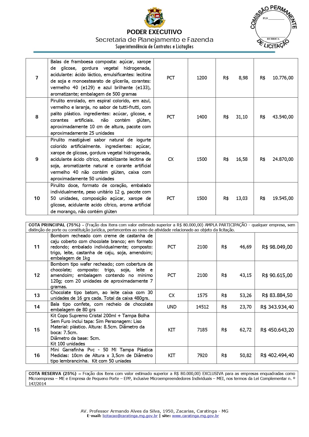 CARATINGA- A publicação de um processo licitatório da Prefeitura de Caratinga para aquisição de guloseimas no valor estimado de até R$ 2 milhões gerou repercussão nas redes sociais. O edital prevê o registro de preços para a compra de balas, pirulitos, paçocas, pipocas, doces sortidos e outros produtos que irão abastecer ações de diversas secretarias municipais.