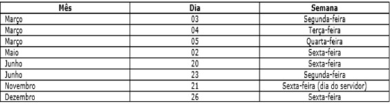 Os feriados de Dia do Trabalho (1° de Maio), Corpus Christi (19 de junho), Consciência Negra (20 de novembro) e Natal (25 de dezembro) serão em uma quinta-feira, possibilitando que as folgas também possam se estender.