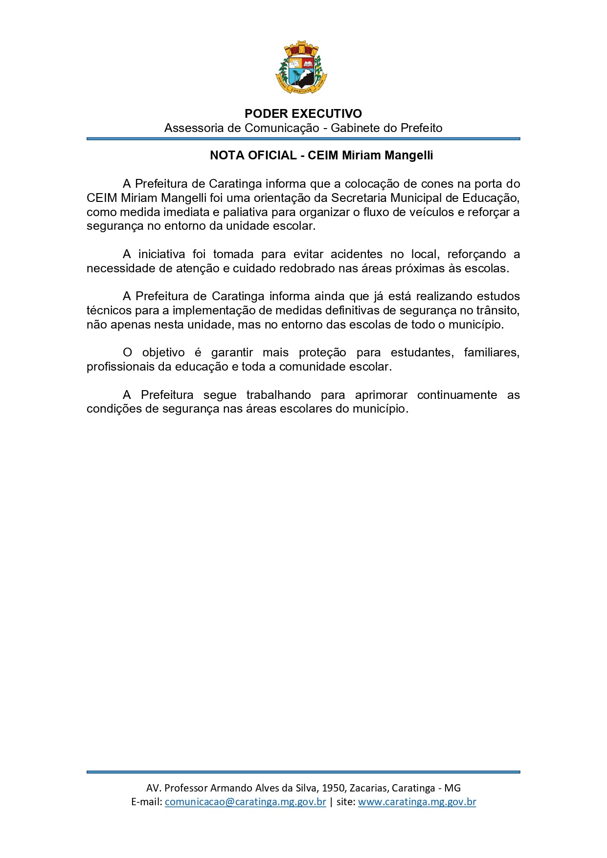 A administração municipal também informou que estudos técnicos já estão em andamento para a implantação de medidas definitivas de segurança no trânsito, não apenas no CEIM Miriam Mangelli, mas em todas as unidades escolares do município.
