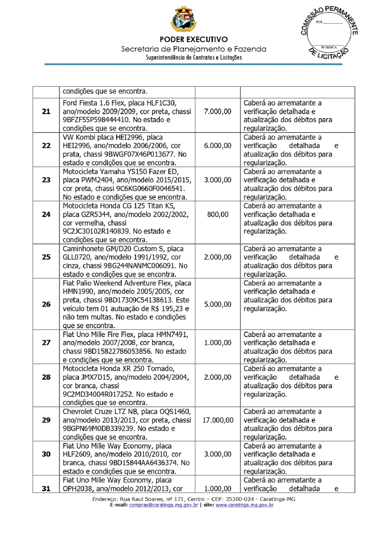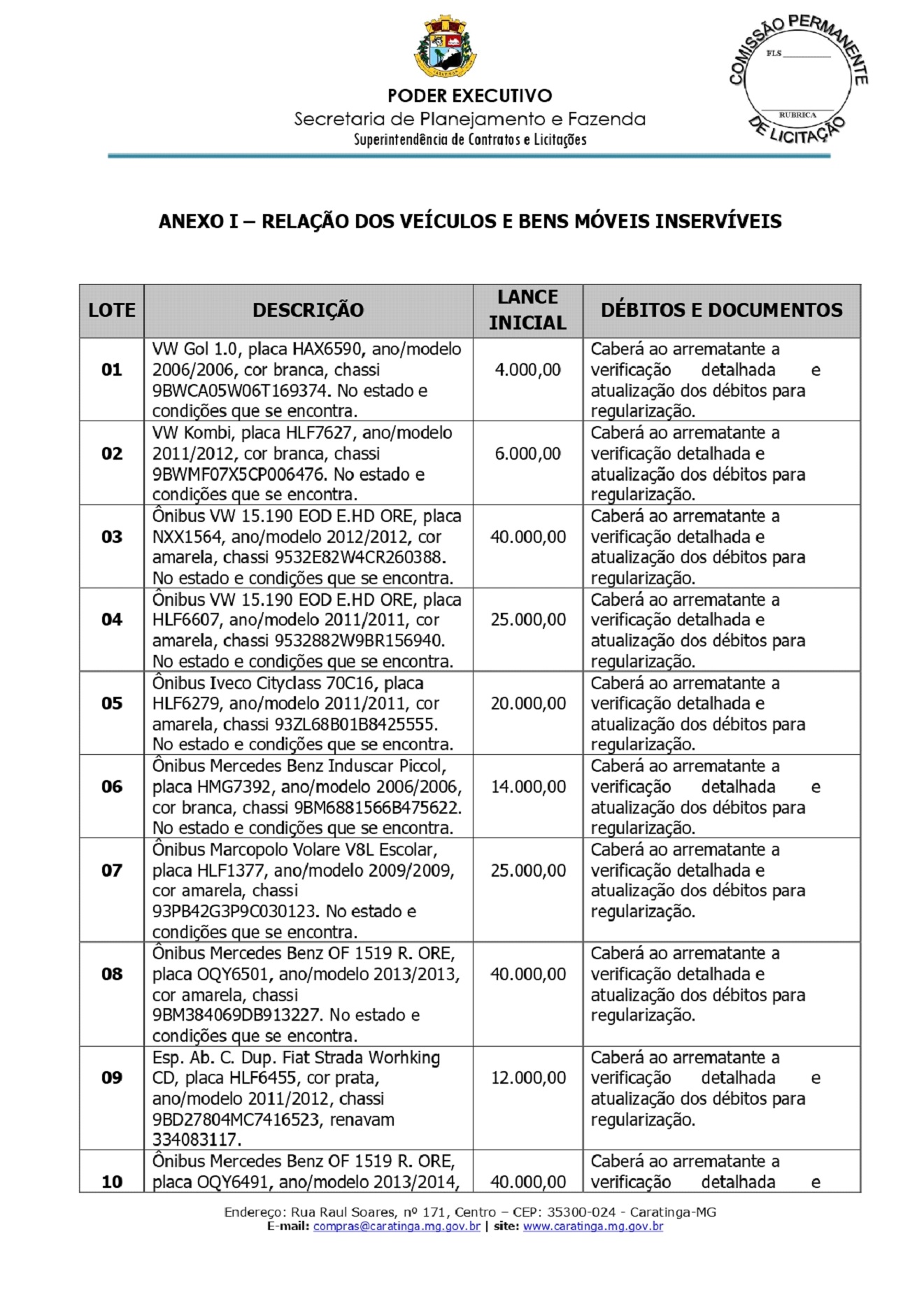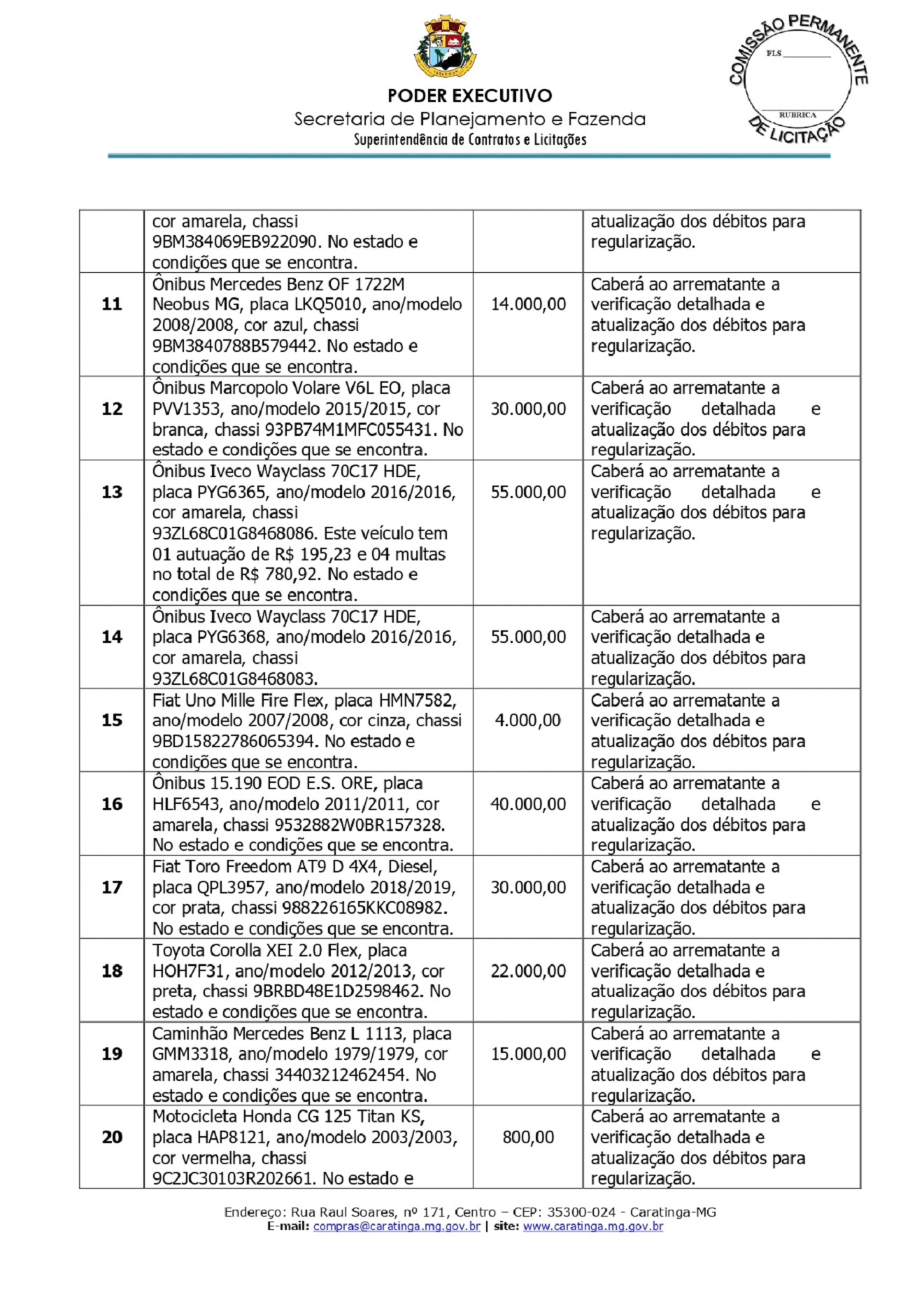 Lotes referentes a veículos (exceto os ônibus): Oficina Mecânica Municipal – Praça Cel. Rafael da Silva Araújo nº 131, Bairro Salatiel. Contato: Falar com Ramires 33 3329-8095.