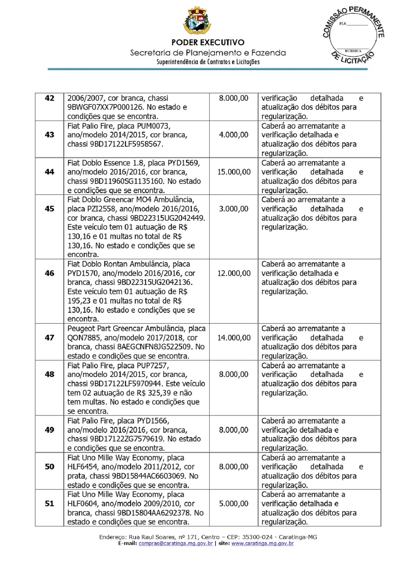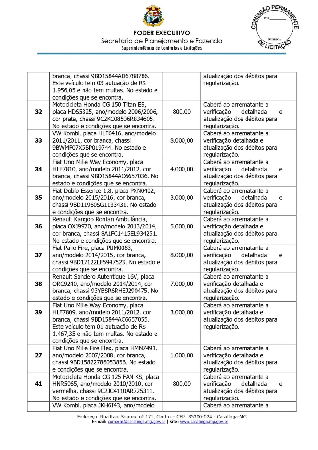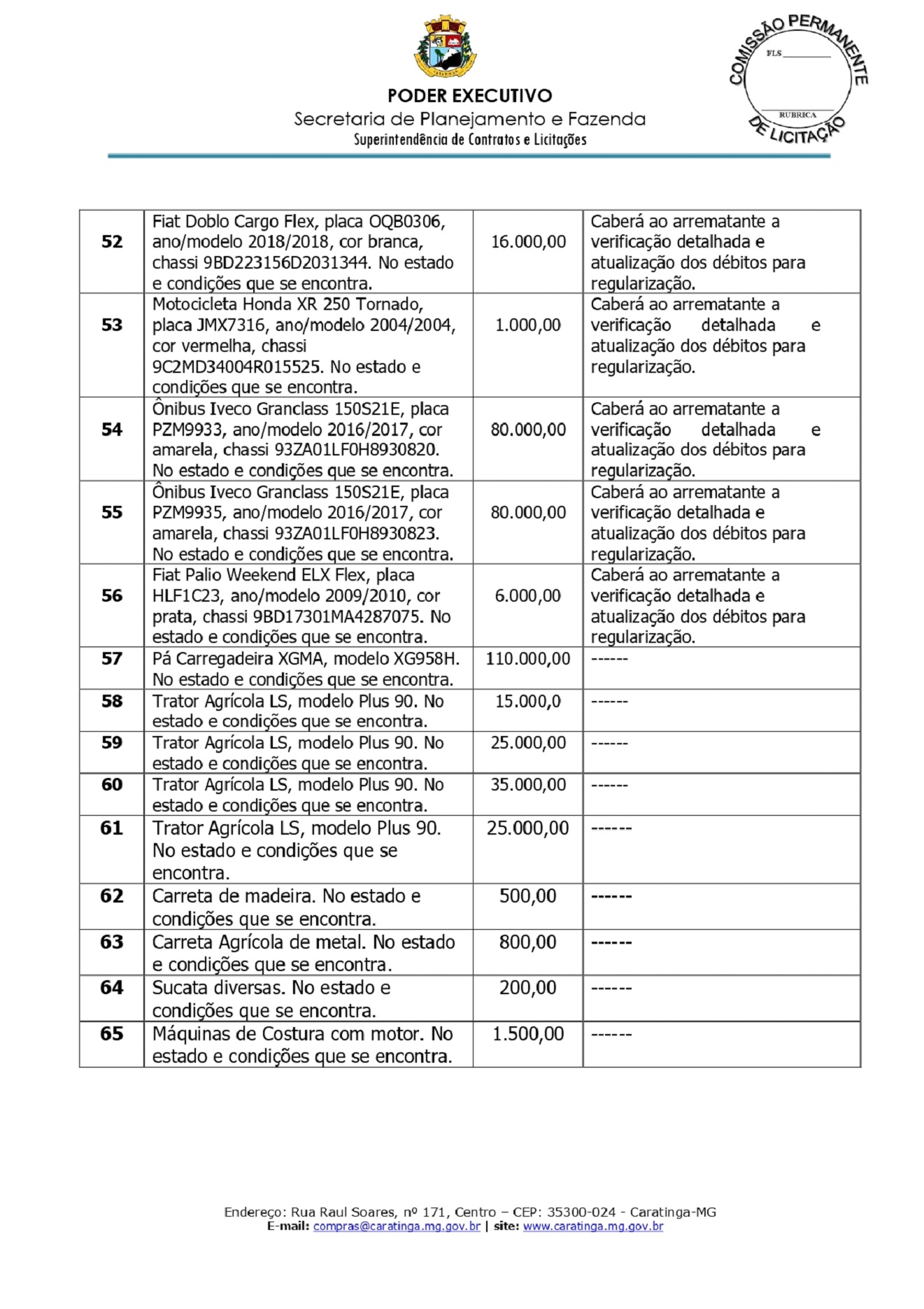 Lotes referentes a veículos (exceto os ônibus): Oficina Mecânica Municipal – Praça Cel. Rafael da Silva Araújo nº 131, Bairro Salatiel. Contato: Falar com Ramires 33 3329-8095.