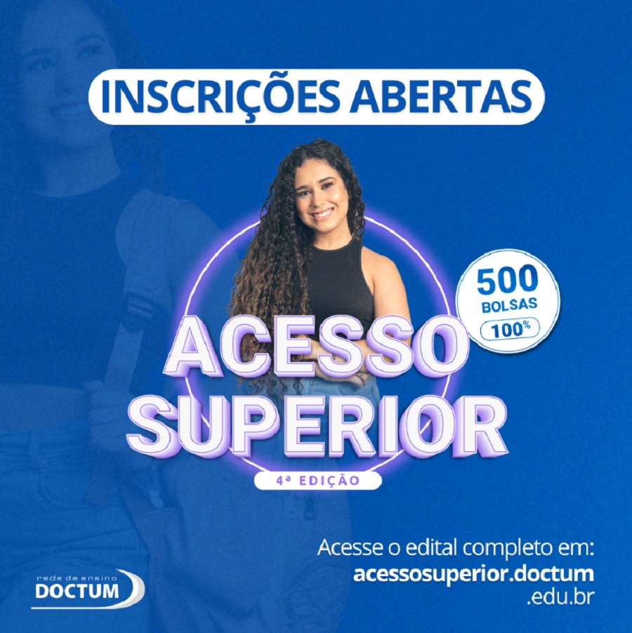 O resultado final do Acesso Superior será publicado no dia 10 de novembro com data prevista em edital para matrícula dos contemplados. A relação de vagas por unidade, curso e modalidade estão no regulamento: acessosuperior.doctum.edu.br.