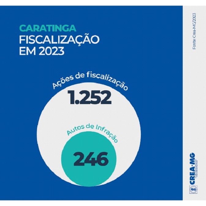 CARATINGA – A fiscalização do Conselho Regional de Engenharia e Agronomia de Minas Gerais (Crea-MG), em 2023, realizou 1.252 ações de fiscalização em Caratinga, com a identificação de 246 irregularidades. Em todo o estado, foram contabilizadas 63.330 ações, que resultaram em 24.799 autos de infração. Desse total, 73,1% foram destinados a pessoas e empresas inabilitadas que atuavam de forma ilegal no exercício das profissões. Já em relação aos 26,9% restantes, a maioria diz respeito à falta de registro da Anotação de Responsabilidade Técnica (ART).