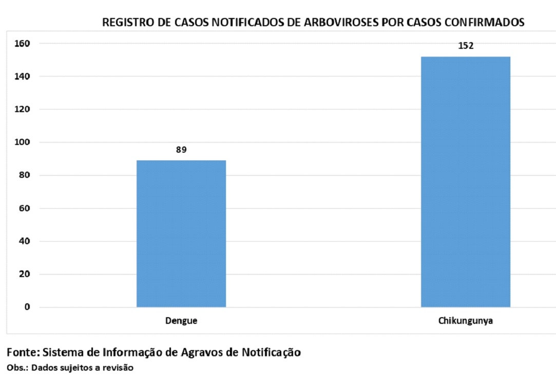 O acumulado de casos confirmados até o momento, desde o início de 2024 é de 89 casos de Dengue e 152 de Chikungunya.