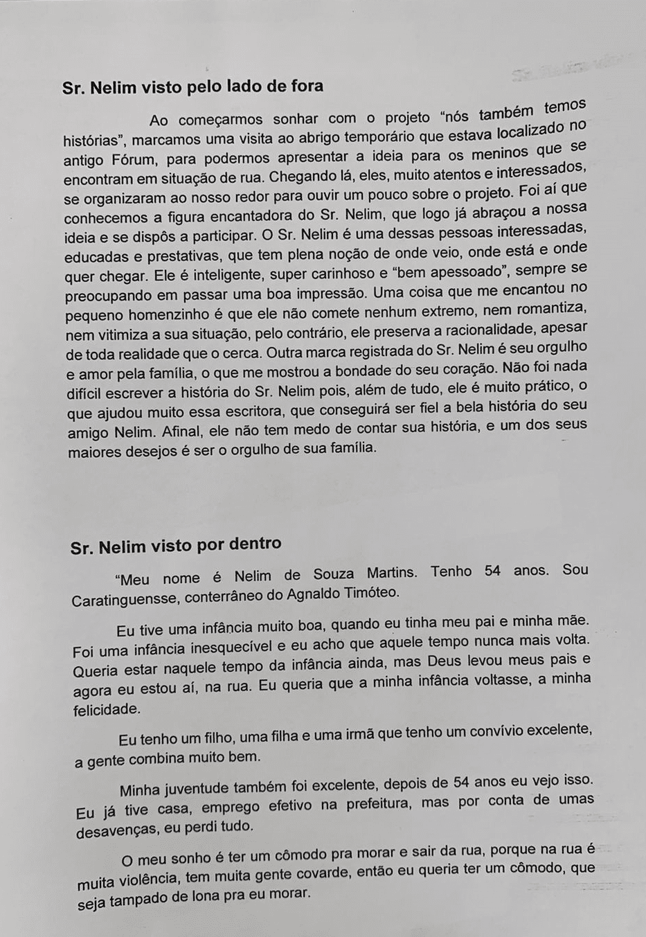 Seu Nelim conta que a vida nas ruas é muito difícil, encarando o medo e as reações da sociedade. E ele tem esperança de mudar os rumos da sua história e recomeçar. “É muito preconceito, violência. Tem gente que se acostuma a ficar na rua, que adapta a ficar na rua. Eu não, eu tenho que trabalhar, tenho que ter meu dinheiro. Estou doido para sair da rua. Louvo e tenho fé em Deus que vou sair da rua. Quero ter uma casinha para esconder do sereno, assim como todos têm vontade. Todo mundo tem sonhos, rua é só Jesus, mas, Deus vai nos abençoar e abençoar quem está com a gente nessa luta”.