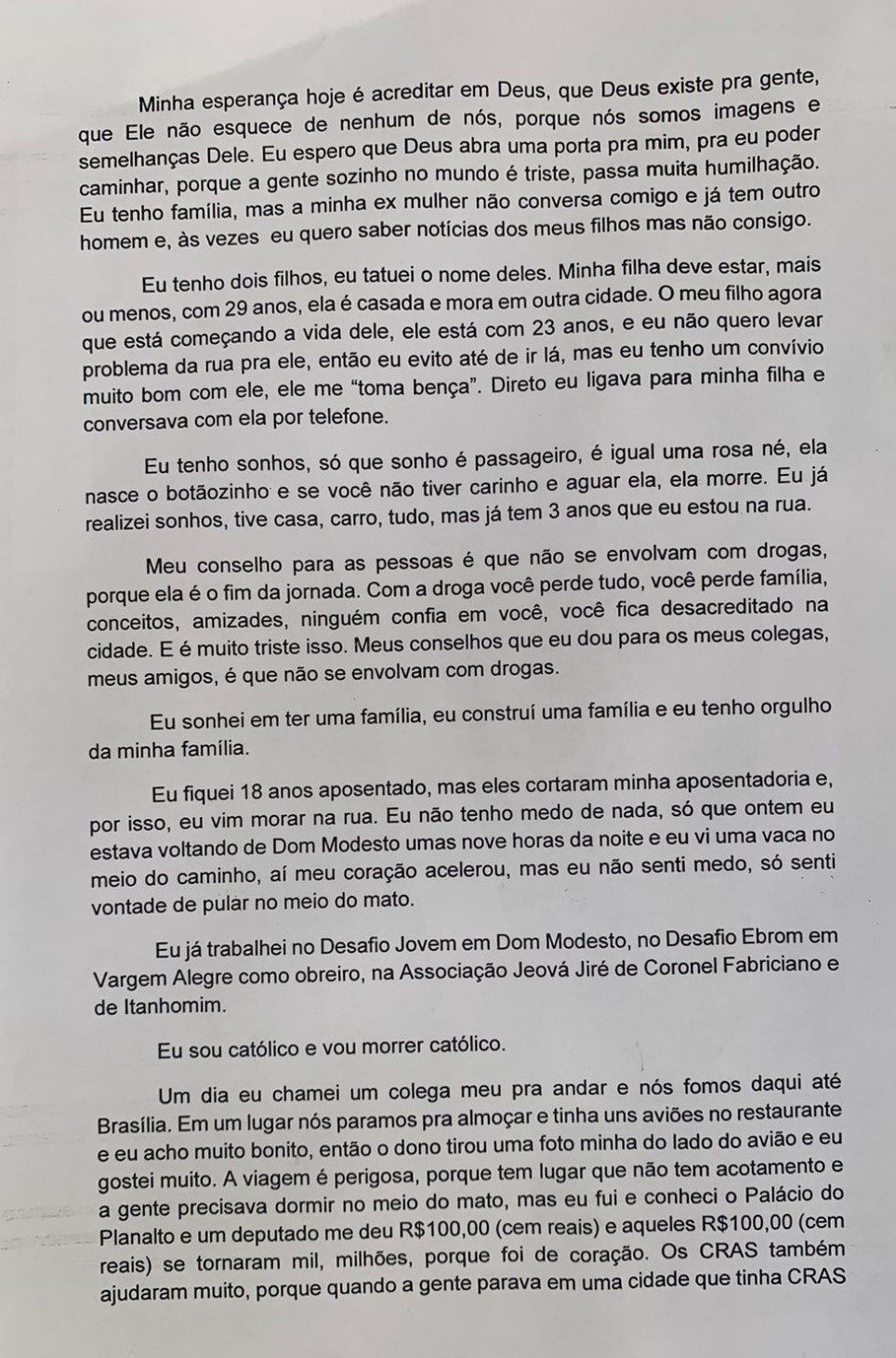 Ao DIÁRIO, ele relatou um pouco sobre sua trajetória. “Eu era aposentado, casado há 17 anos e divorciei, deu um desacerto e vim para a rua. Mas, agradeço a Deus também, porque esse projeto que a doutora Flávia Alves (voluntária) está apresentando para nós é um sinal que tudo vai dar certo, que a gente pode sair da rua”.