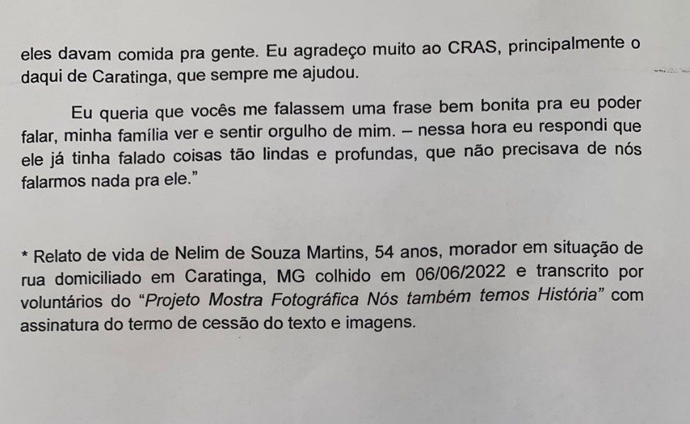 CARATINGA- “Nós também temos histórias”. O “nós” se refere às pessoas em situação de rua e o “também” remete ao preconceito enfrentado por essa população que tem a suas vivências, experiências e sonhos, mas, isso muitas vezes passa despercebido. O convite olhar mais sensível e empática a essas pessoas se dá por meio de uma mostra fotográfica que está disponível no coreto da Praça Cesário Alvim.
