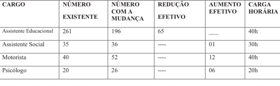 Por outro lado, foram criadas uma vaga para o cargo de Assistente Social; seis vagas para psicólogo e 12 vagas para motorista. Todas as vagas serão ocupadas por meio de concurso público.