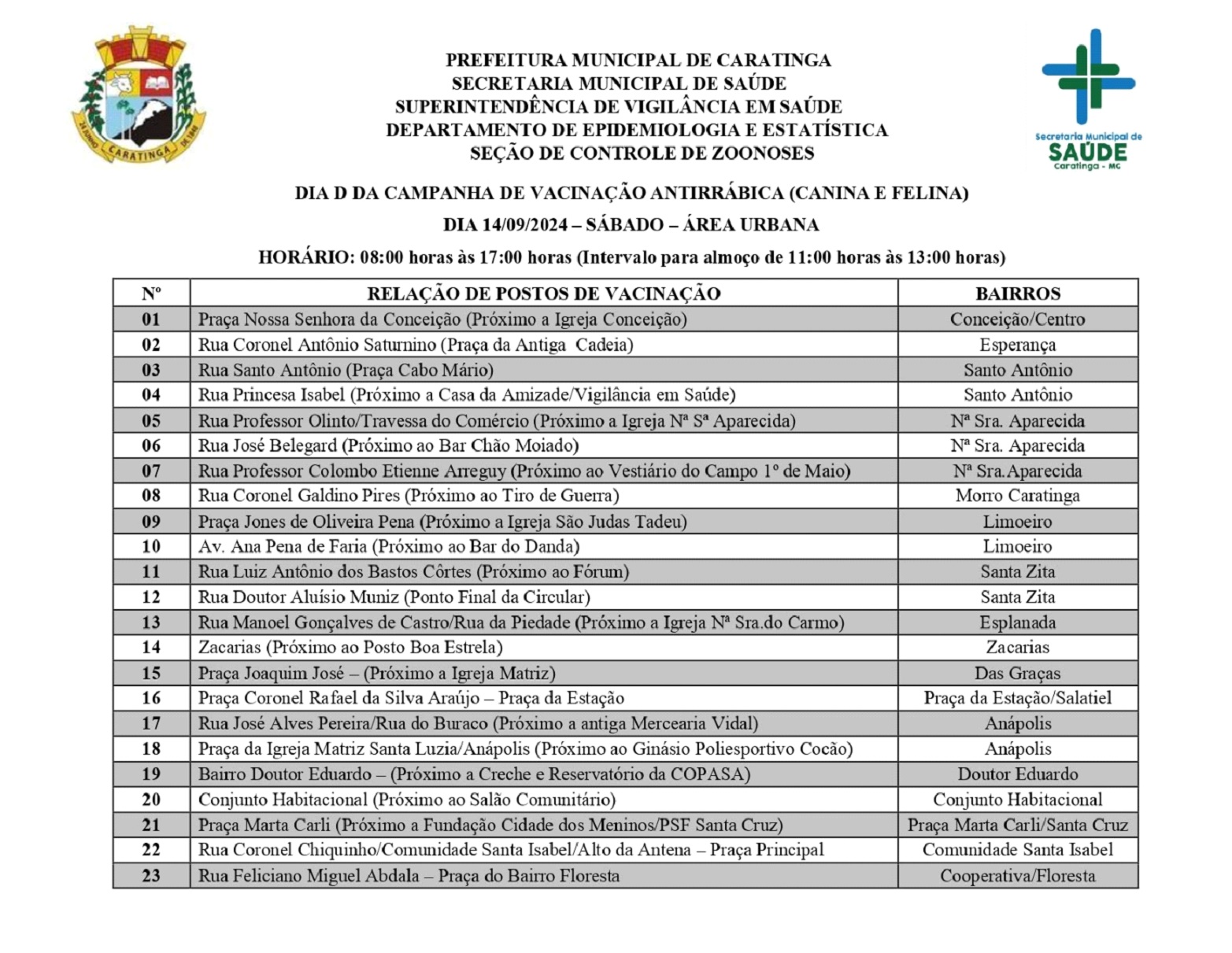 CARATINGA- A campanha de vacinação antirrábica animal encerra os trabalhos nos distritos de Caratinga no dia 13 de setembro. O Dia D da campanha na sede do município acontecerá no dia 14 de setembro. A meta é imunizar na zona rural 7.900 cães e 1.540 gatos e na zona urbana 6 mil cães e mil gatos. Totalizando, ao final da campanha, 16.440 animais vacinados.