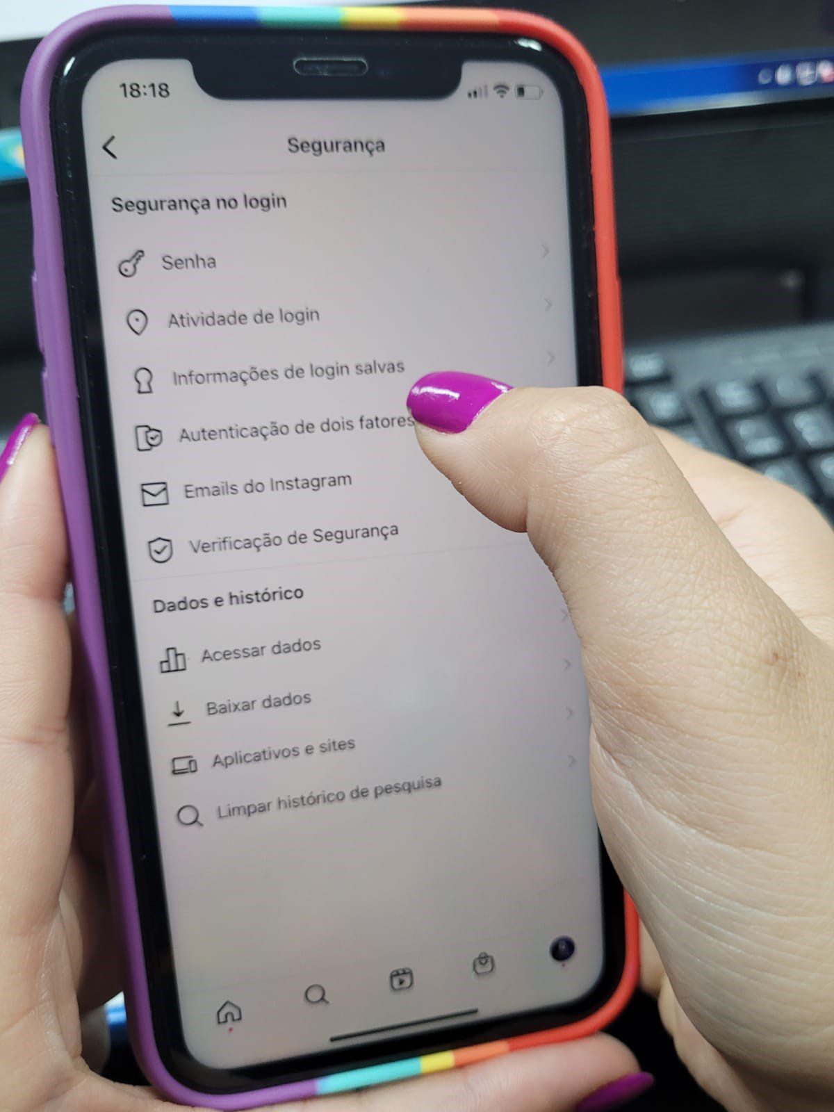 A autenticação de dois fatores precisa de uma autenticação extra para validar que o acesso é realmente seu. A primeira validação é pelo nosso próprio e-mail e própria senha. A segunda pede um fator externo, pode ser seu número de celular para chegar o SMS ou e-mail. É reconhecer um dispositivo que entrou na sua conta, novo, quer realmente uma validação sua, que foi realmente você ou não. Caso negativo tem como você clicar que não foi você e esse acesso é automaticamente cortado e invalidado. Por isso é muito importante colocar no Facebook e Instagram.