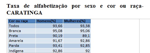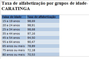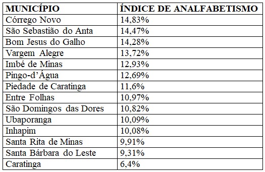 Na região, as cinco maiores taxas de analfabetismo estão concentradas em Córrego Novo, São Sebastião do Anta, Bom Jesus do Galho, Vargem Alegre e Imbé de Minas. Já as cinco menores taxas estão em Caratinga, Santa Bárbara do Leste, Santa Rita de Minas, Inhapim e Ubaporanga.