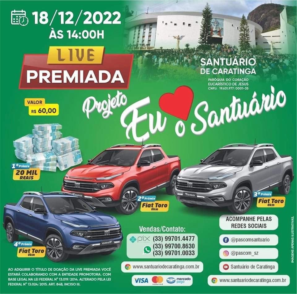 CARATINGA- A Paróquia do Coração Eucarístico de Jesus- Santuário de Caratinga está promovendo uma Live premiada dentro do projeto “Eu amo o Santuário”. Pelo valor de R$ 60 é possível adquirir uma cartela e concorrer. São quatro prêmios: R$ 20.000 e três Fiat Toro 0 km.