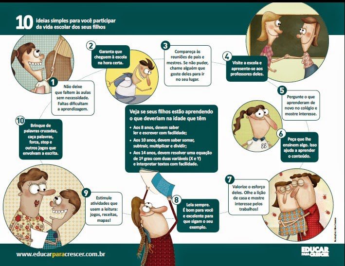A cartilha Educar para Crescer destaca, dentre as dez ideias, que a família deve ser participativa na escola, de modo a acompanhar o desempenho dos filhos, estimular a leitura e a prática de exercícios lúdicos como caça palavras e palavras cruzadas, por exemplo.