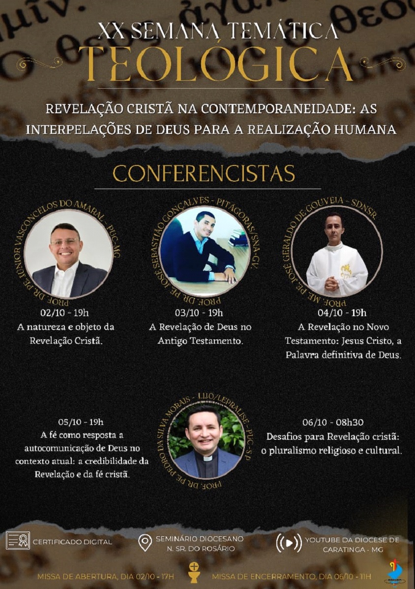 A XX Semana Temática Teológica será realizada de forma presencial com transmissão online pelo canal do YouTube da Diocese de Caratinga, como afirma o seminarista Bruno Kened Ferreira. “O evento terá principalmente conferências com a exposição dos temas por professores das respectivas áreas. No primeiro dia, apresentará a introdução acerca da natureza e objeto da Revelação cristã na história; no segundo dia, será apresentado o desenvolvimento da Revelação Divina no Antigo Testamento; no terceiro dia, discorrerá sobre o desenvolvimento da Revelação no Novo Testamento e sua culminância na pessoa de Jesus Cristo; no quarto dia, tratará da fé como resposta à autocomunicação de Deus em Jesus Cristo e da credibilidade da fé e da Revelação. Por fim, no quinto dia, explanará sobre os desafios para a interpretação da Revelação Cristã no contexto atual tendo em vista o pluralismo religioso e cultural. As conferências acontecerão nas dependências do Seminário Diocesano de Nossa Senhora do Rosário e serão abertas para a participação dos diversos públicos”.