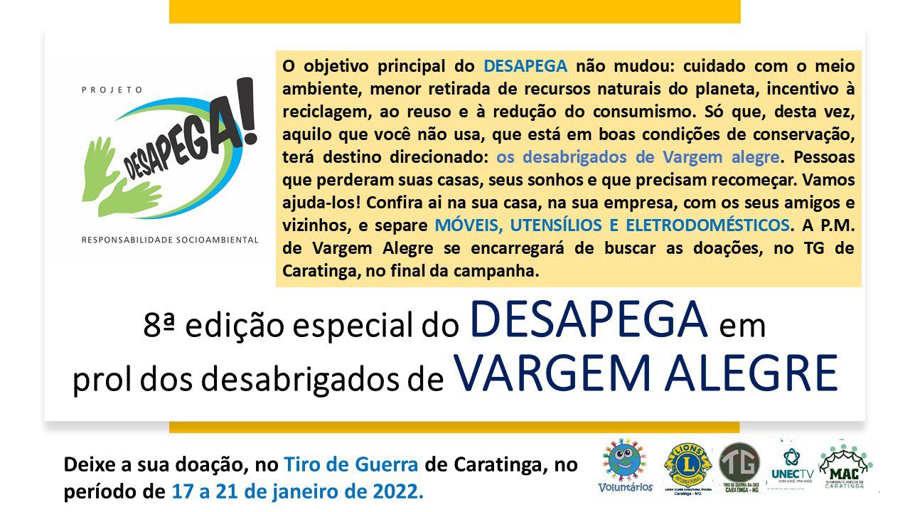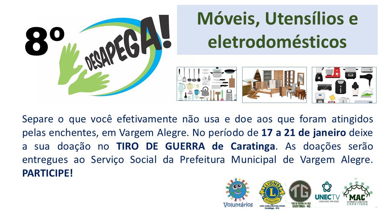 “O Lions Clube Caratinga Itaúna é parceiro desde a primeira edição do ‘Desapega’. Este é um projeto muito ousado porque a gente tira de casa coisas em bom estado de conservação para doar a quem mais necessita. Nesta 8ª edição a finalidade é socorrer uma comunidade sofrida pelas chuvas que é a vizinha cidade de Vargem Alegre. Então o nosso clube de serviços está de portas abertas para contribuir com esta campanha e vamos divulgar, o máximo possível, para ajudar esta comunidade.”, destacou a presidente do Lions Clube Caratinga Itaúna, Vânia Celeste.