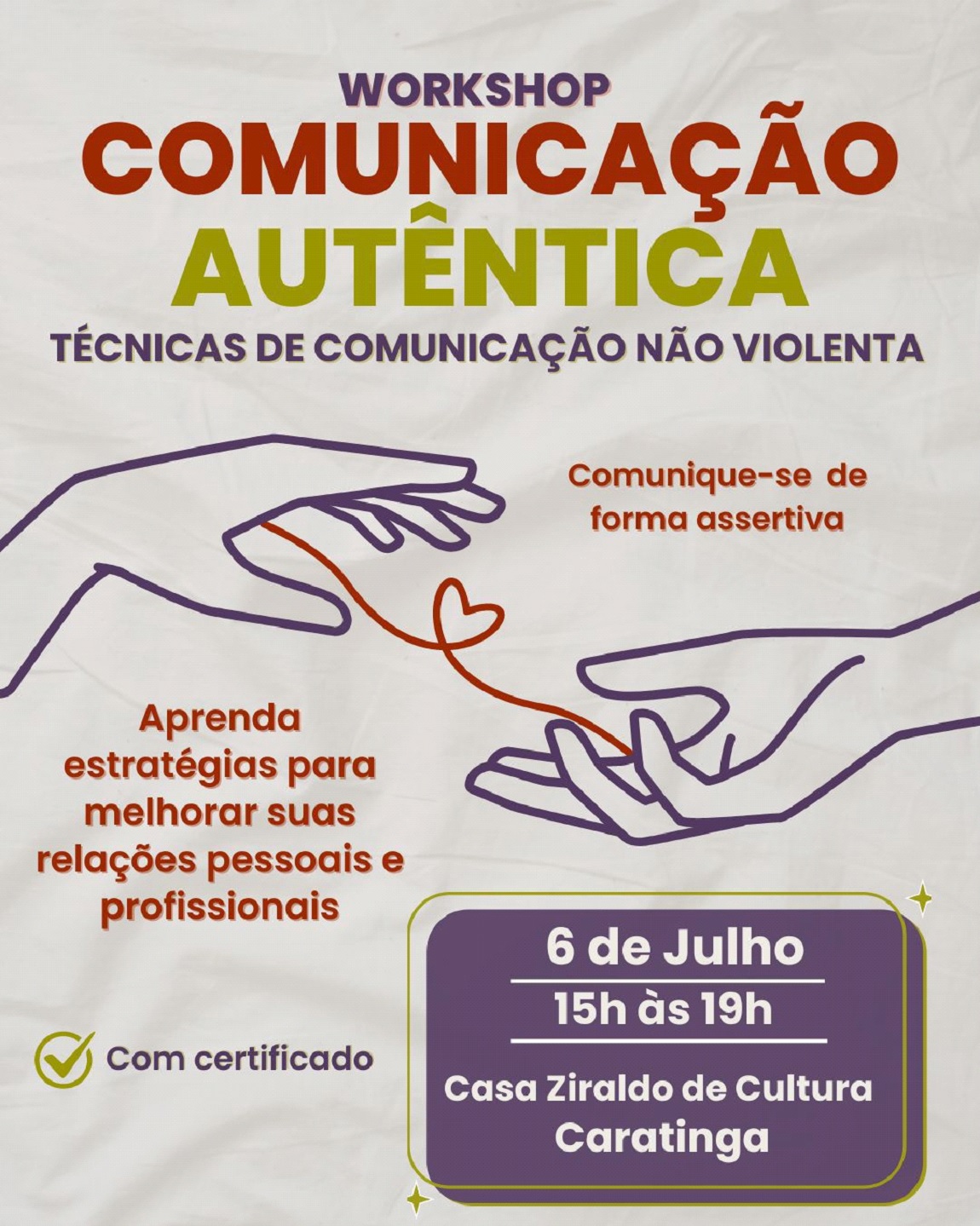 CARATINGA – Caratinga sediará um importante evento para aqueles que desejam aprimorar suas habilidades de comunicação e se expressar de forma mais segura e autêntica. No próximo sábado, 6 de julho, das 15h às 19h, a cidade recebe o Workshop de Comunicação Autêntica: Técnicas de Comunicação Não Violenta (CNV).
