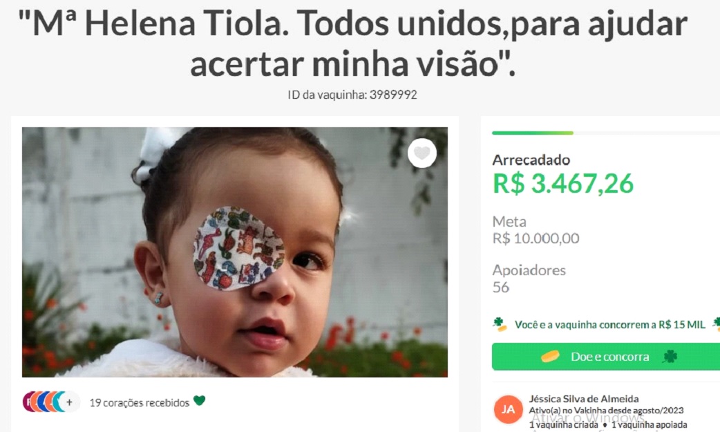 Antes de optar pelo procedimento particular, a família tentou pelo SUS, no entanto, diante da demora, eles decidiram realizar a vaquinha. “Já tem mais de um ano e até o presente momento da criação dessa vaquinha não tivemos nem a consulta com oftalmologista pelo SUS. Não tivemos nenhum retorno”.