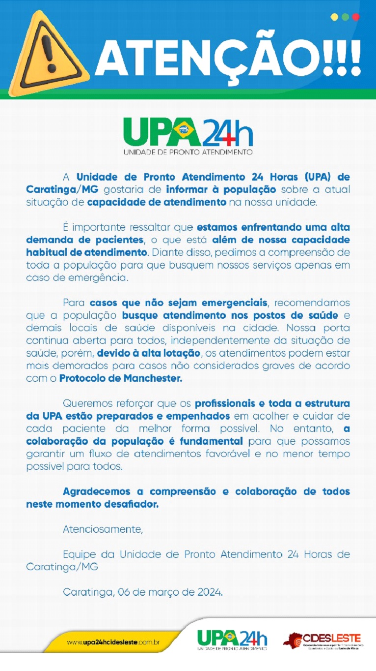 CARATINGA- A Unidade de Pronto Atendimento (UPA) 24 Horas emitiu uma nota à imprensa sobre a capacidade de atendimento com a alta demanda de pacientes.