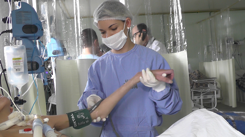 Com autorização da direção clínica, a reportagem esteve também na UTI Adulto, que é para onde são levados os pacientes que dão entrada em estado grave no hospital, para conhecer a rotina de trabalho dos profissionais daquele setor. Fomos recebidos desta vez pela fisioterapeuta Thaíse Martins, que relatou os resultados positivos obtidos na unidade. “Atuamos no auxílio de restabelecimento da condição clínica e física do paciente em suas situações de necessidades cardiorrespiratórias enquanto ele está internado na UTI. O índice de melhora é de 70% com a fisioterapia motora e respiratória”.