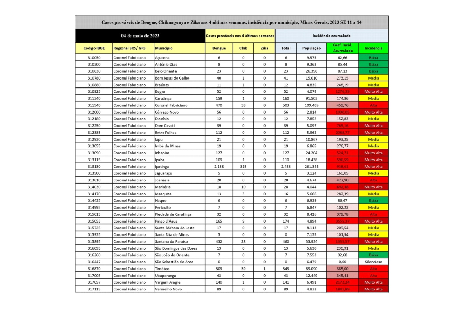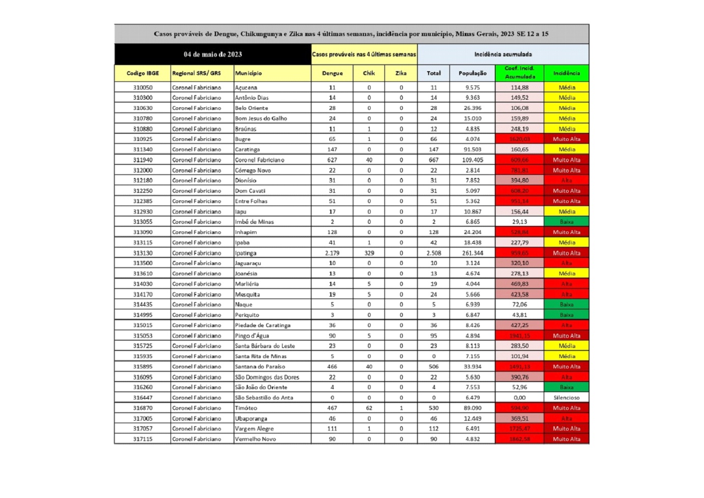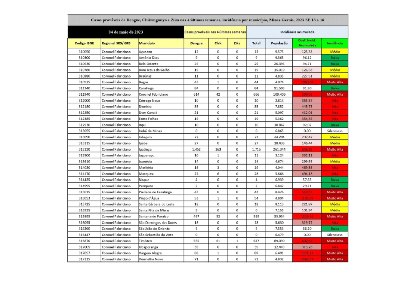 CARATINGA- A Vigilância Epidemiológica de Caratinga divulgou planilhas de incidência dos casos prováveis de Arboviroses das semanas epidemiológicas de 11 a 16 dos municípios que compõem a Superintendência Microrregional de Saúde de Coronel Fabriciano.