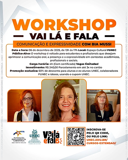 O Workshop Vai Lá e Fala – Comunicação e Expressividade será realizado no dia 6 de dezembro, das 13h às 17h, no Espaço Cultural FUNEC. As inscrições podem ser feitas pelo link tinyurl.com/extensaoworkshop ou pelo QR Code disponível na divulgação.