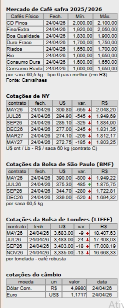 Os contratos de arábica para maio próximo na ICE Futures US, oscilaram 1.015 pontos entre a máxima e a mínima, batendo, na máxima do dia, em US$ 2,9850 por libra peso, em alta de 65 pontos. Encerraram o dia valendo US$ 2,8930 por libra peso, em queda de 715 pontos (2,56%). Na ICE Europe, os contratos de robusta para maio próximo, bateram na máxima do dia, em 3.471 dólares por tonelada, em queda de 3 dólares. Fecharam o pregão a 3.388 dólares, com perdas de 86 dólares (2,47%).
