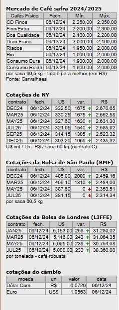 Na ICE Europe, em Londres, os contratos de robusta para janeiro, bateram sexta-feira (6) em 5.193 dólares na máxima do dia, em alta de 298 dólares. Fecharam a US$ 5.193 por tonelada, com ganhos de 258 dólares. Todos os contratos de robusta com vencimento até julho de 2025 na ICE Europe fecharam cotados a partir dos cinco mil dólares por tonelada.