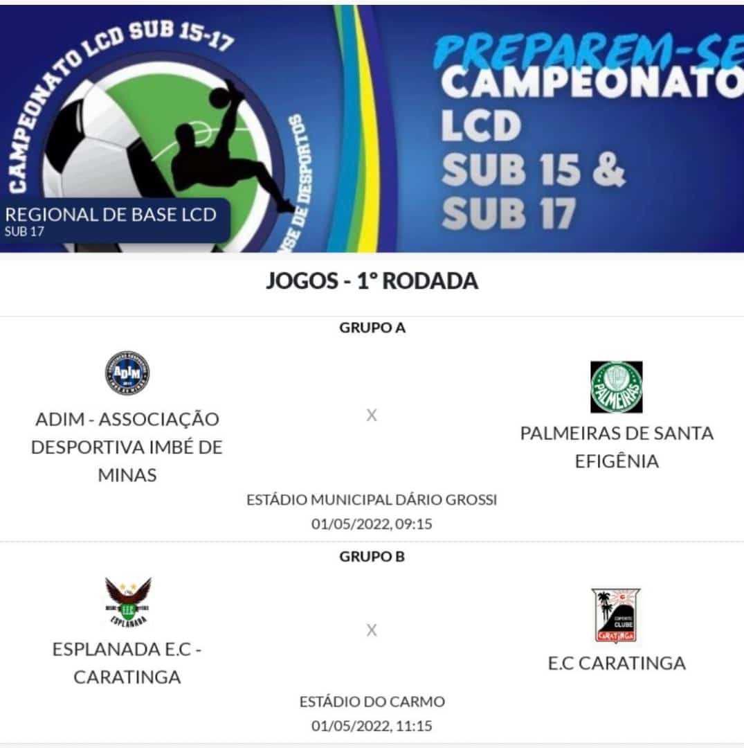 Na última terça-feira (26), aconteceu o arbitral da Liga Caratinguense de Desportos para definição do campeonato Regional Sub15 e Sub 17. Domingo, agora dia 1° de maio, a bola rola em oito jogos, quatro partidas em cada categoria. A promoção da competição é apenas a primeira que a LCD pretende realizar este ano. Em votação realizada na primeira reunião, a maioria dos clubes optaram por isso uma competição “fechada”, significa que apenas atletas que residem na cidade ou distritos estão aptos a disputarem a competição. Algumas equipes não conseguiram cumprir tal exigência e acabaram ficando fora: Caratinga, Esplanada, 1° de Maio, Leopardo de Santa Rita, A.A. de Ubaporanga, ADIM de Imbé de Minas, Palmeiras de Santa Efigênia, são as equipes que irão para a disputa. Todos os participantes se mostraram muito motivados e com grande expectativa para toda temporada.