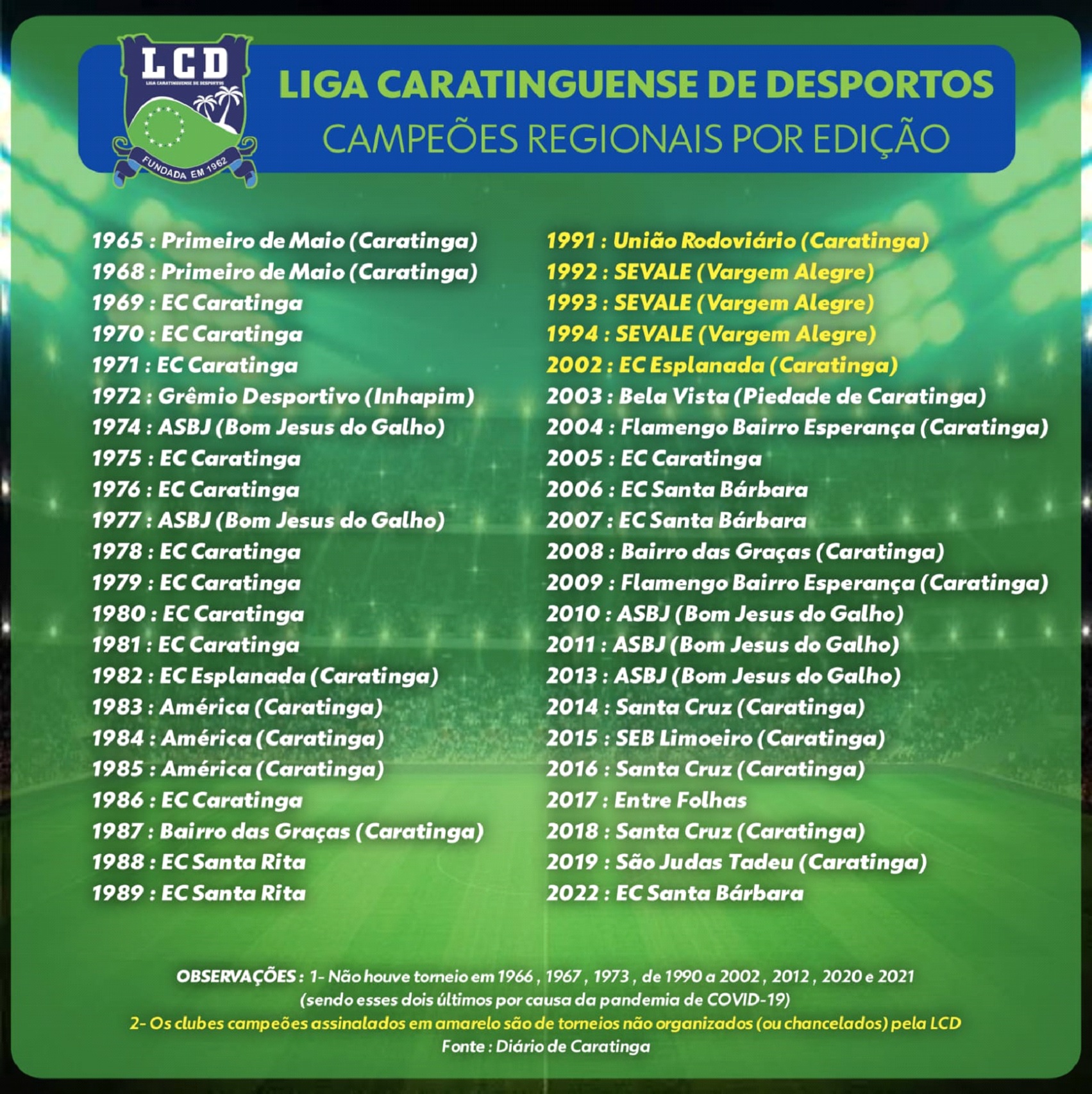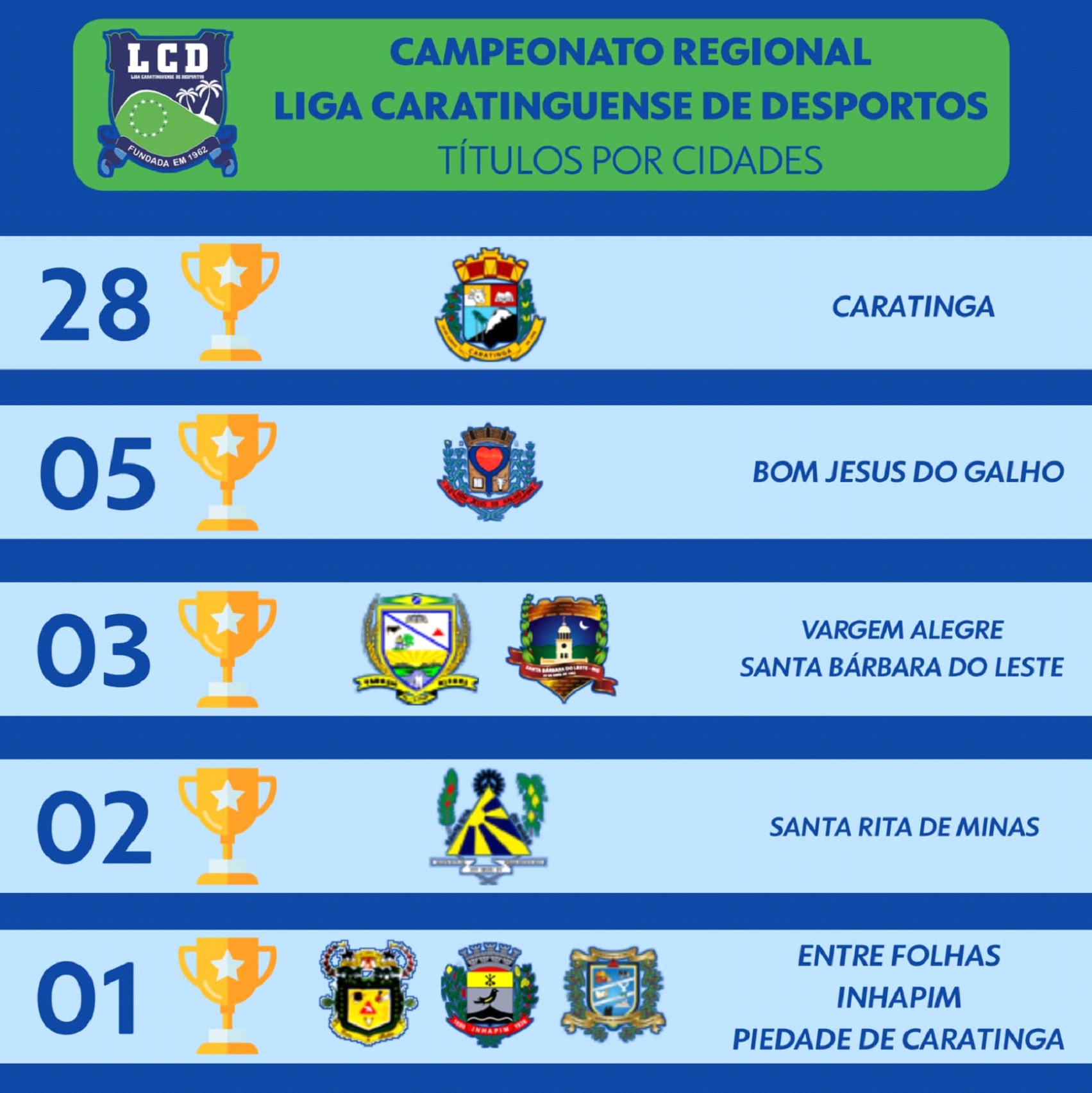 De 1965 até hoje, apenas oito cidades já sentiram o gostinho de ter um time campeão da LCD: Caratinga, Bom Jesus do Galho, Santa Rita de Minas, Santa Bárbara do Leste, Inhapim, Piedade de Caratinga, Vargem Alegre e Entre Folhas.