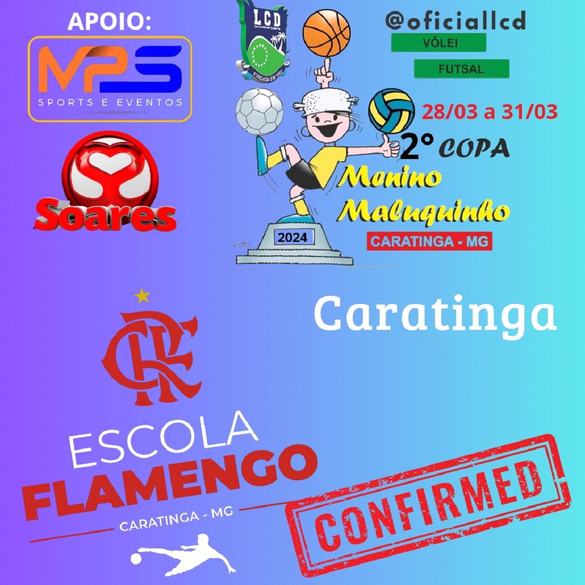 De Caratinga, a Escolinha franqueada do Flamengo, pela primeira vez irá disputar a Copa, trazendo um trabalho super bem feito, sério e comprometido com a história de formação do clube. Sem dúvida uma atração para a Menino Maluquinho.