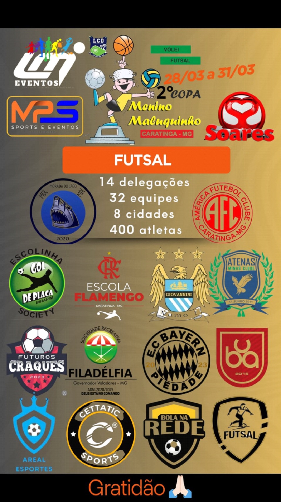 Cresce a expectativa para o início da segunda edição da Copa Menino Maluquinho. A competição que será promovida pelo segundo ano consecutivo pela Liga Caratinguense de Desportos, mais uma vez irá movimentar a cidade nos dias 28, 29, 30 e 31 deste mês. Se os números do ano passado surpreenderam positivamente, tudo leva a crer que 2024 será ainda melhor em participações. Só na modalidade futsal, o número de atletas inscritos já ultrapassou a casa de quatrocentos. São 32 equipes, 14 delegações de oito cidades de diferentes regiões. Quando se encerrarem às inscrições do voleibol essa semana, teremos a totalização do número de atletas na edição número 2 da Copa Menino Maluquinho. Na próxima quinta-feira (7), os sorteios dos grupos e confrontos será uma prévia do enorme sucesso da competição. A cada dia que se aproxima a data de início, o assunto domina às redes sociais dos clubes, projetos e atletas, que estão loucos para começar logo.