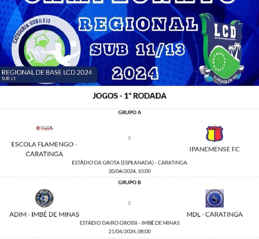 A garotada está contando os dias para entrar em campo para mais um Campeonato Regional da LCD de base. Os meninos de 11 e 13 anos começam no próximo sábado (20) a disputarem mais um certame. Afinal, promover competições de base, é um dos compromissos da atual gestão da LCD: Escola do Flamengo, ADIM de Imbé de Minas, Projeto Vermelho Novo, Morada do Lago, Cettatic, Ipanemense estão na disputa. Não tenho a menor dúvida que novamente teremos uma grande competição, cujo principal objetivo, é colocar a meninada em atividade. Como sempre escrevo e digo em todas às oportunidades, o esporte salva e transforma vidas.