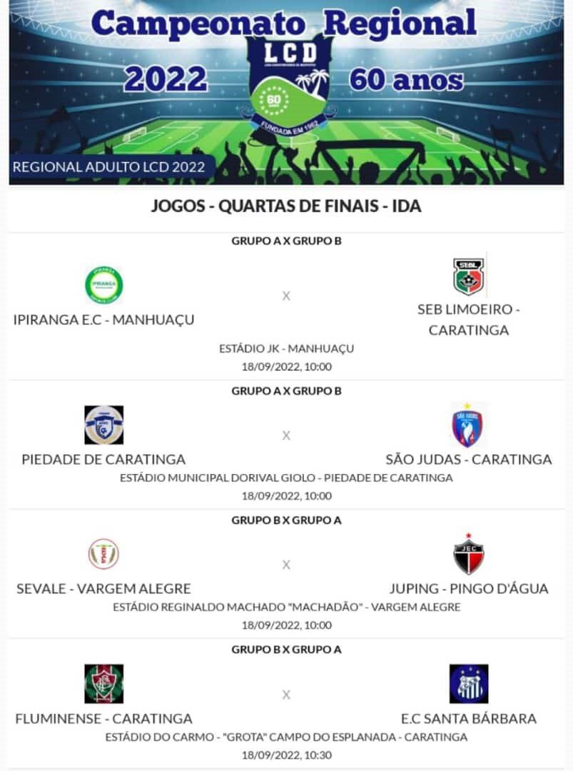 Depois de um final de semana de folga, entramos na semana de expectativa para o começo das quartas de finais do Campeonato Regional adulto. Quatro grandes jogos prometem sacudir o futebol em quatro cidades da região. Curiosamente, até mesmo quem fez às melhores campanhas na fase de grupos, não assume favoritismo para o mata-mata. Portanto, pode apostar, será um domingo de grandes jogos.