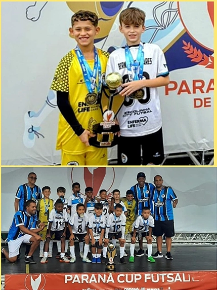 Dois talentos promissores de nossa cidade conquistaram título importante este final de semana, no Paraná. Bernardo Gimenes e Vitor Toneli foram convidados para reforçar o City Nova Lima, representante mineiro na Paraná Cup de futsal, categorias Sub-11 e Sub-12. Em Caratinga, os meninos são atletas da Jairo Futsal e Cettatic. Depois de uma ótima competição, conquistaram o título no Sub-11 e ficaram com o vice no Sub-12.