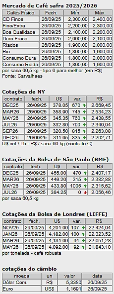 Como todos os anos, o início da primavera e com ela a chegada das chuvas sobre os cafezais do Brasil, maior produtor e exportador de café do mundo, pressionaram as cotações do café. “Em nossa opinião, os baixos estoques mundiais, a quebra maior que a inicialmente estimada na atual safra brasileira 2025, o clima irregular, que amplia as preocupações sobre o tamanho de nossa próxima safra, em 2026, mais a desorganização do comércio mundial de café, com a imposição pelo presidente Trump de uma tarifa de 50% sobre as exportações brasileiras de café para os EUA, continuarão provocando fortes oscilações nas cotações do café em Nova Iorque e Londres”, avaliou o Escritório Caravalhaes, de Santos/SP.