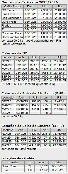 O dólar caiu 0.04% frente ao real, encerrando a sexta-feira (3) a R$ 5,3370. Fechou a sexta-feira passada (26/9) a R$ 5,3380 e a sexta-feira anterior à passada (19) a R$ 5,3210. Em reais por saca, os contratos para setembro próximo na ICE Futures US fecharam valendo R$ 2.758,61. Encerraram a última sexta-feira a R$ 2.669,45 e a sexta-feira anterior à passada a R$ 2.579,65.