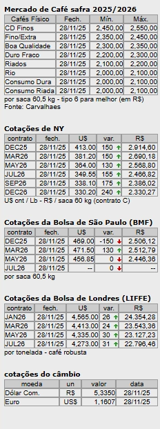 Nesta primeira semana de trabalho após a retirada pelo governo americano da tarifa de 40% sobre as exportações brasileiras de café para os EUA, os contratos de café na ICE Future US em Nova Iorque e na ICE Europe em Londres, oscilaram forte, mas apresentaram um balanço positivo nas cotações. Na sexta-feira (28/11) esses contratos trabalharam e fecharam em alta moderada.